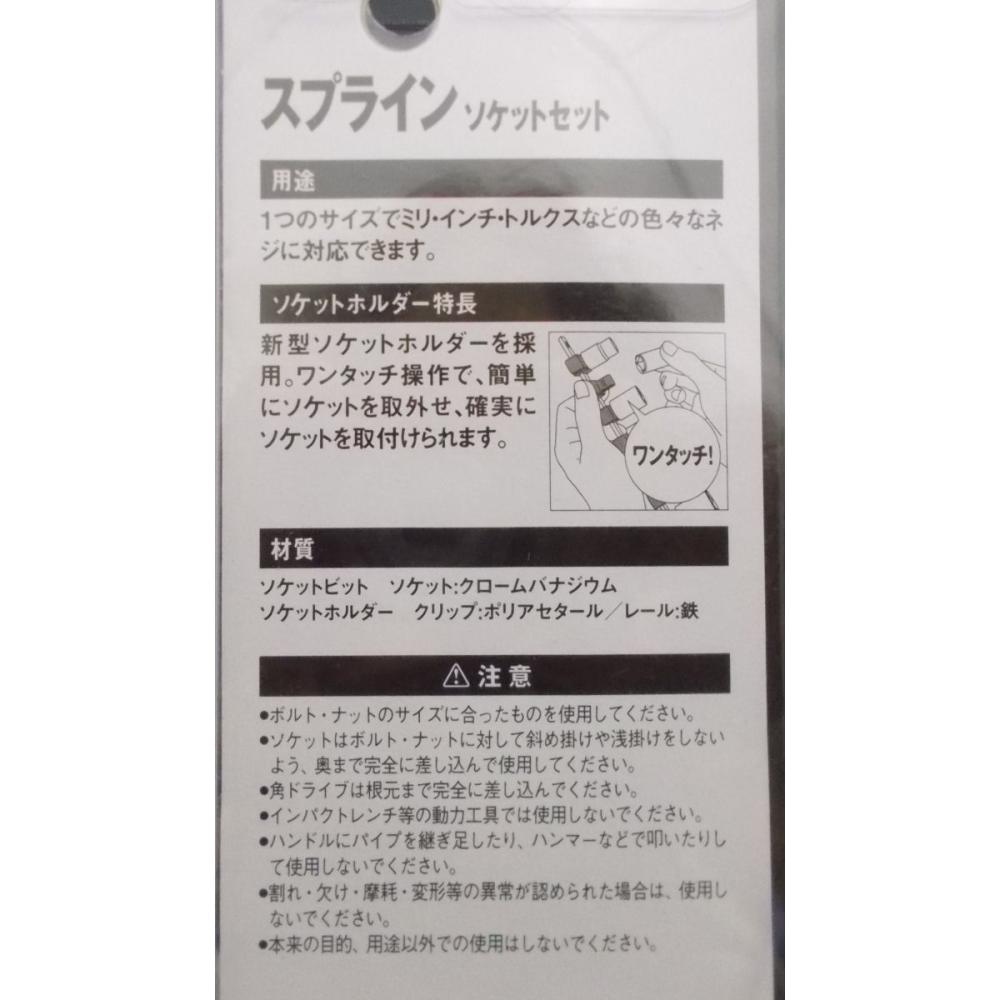 ●差込角:9.5mm(3/8インチ)。●サイズ内容:8・10・11・12・13・14・16・17・19mm。●対応サイズ内容(インチボルト):5/16・3/8・7/16・15/32・1/2・5/8・3/4インチ。●対応サイズ内容(E型トルクスネジ):E10・E12・E14・E16・E18・E20・E24。●ソケットホルダー付。●クリップ色:赤。●ソケット:クロームバナジウム鋼。●ソケットホルダークリップ:ポリアセタール。●レール:鉄。