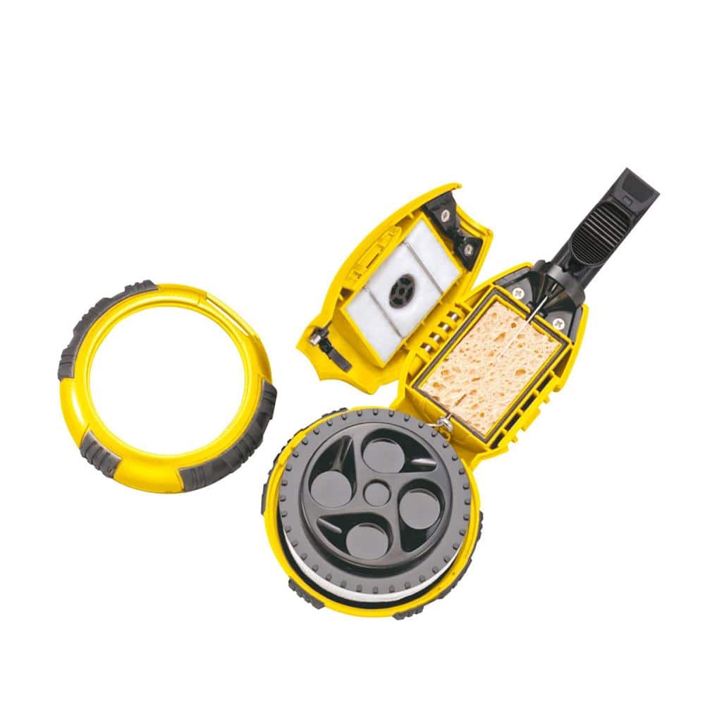 狭い所やコーナーに最適な鶴首付です。本体が工具なしで全開し、お手入れや糸交換が簡単にできます。ゴムパッキンを要所に使用、墨漏れしにくく墨汁の乾燥を防ぎ、長期使用が可能です。糸に墨汁を均一に染み込ませることができる綿押え付です。