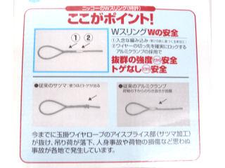●安全をWで追及したWスリング。トゲなし玉掛ワイヤー、JISワイヤー使用。入念な編み込みとワイヤーの切っ先を確実にロックするアルミクランプの採用で抜群の強度だから安全トゲなしだから安全。SPEED UP 荷物の下から引き抜きOK! SAFETY UP トゲがささらないWの安全