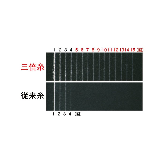 チョークをたっぷり含むポリエステル素材と剛性の高いナイロン素材を編みこむ新製法のオリジナル糸により、一回の引き出しで連続して3回の墨打ちが可能です。本体カバーがエラストマー樹脂なので、滑りにくく、耐衝撃性に優れています。一回転で3倍巻き取るはや巻仕様です。
