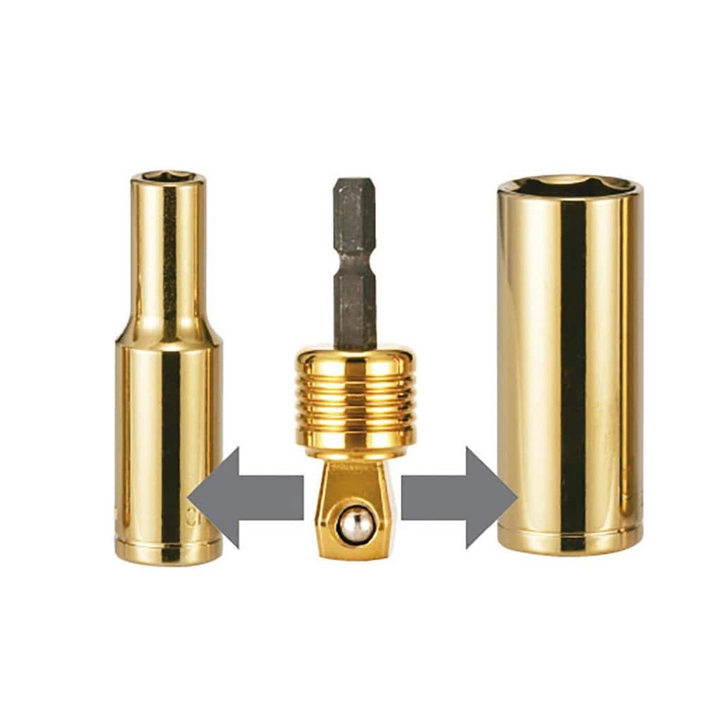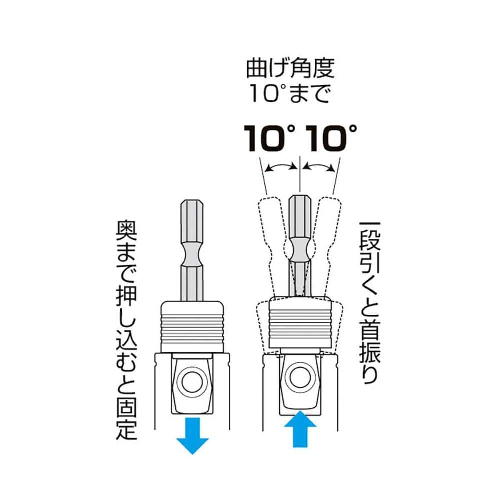 手廻しソケットが使える固定・10度首振り兼用タイプです。18Vインパクトドライバー対応です。ハンドソケットが使えるアダプターです。引くと首振り、押すと固定の2通りの使い方ができます。