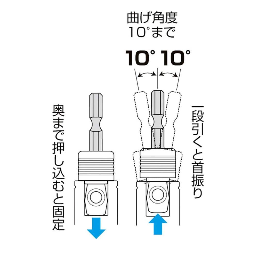 手廻しソケットが使える固定・10度首振り兼用タイプです。18Vインパクトドライバー対応です。ハンドソケットが使えるアダプターです。引くと首振り、押すと固定の2通りの使い方ができます。