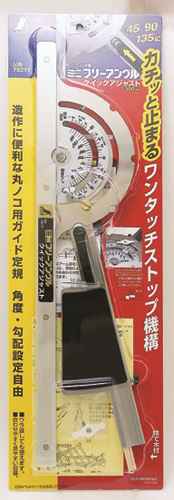 材料を丸ノコで切断するときに使用するガイド定規 ・角度の設定ができます。 角度及び勾配目盛付きです。 刃先位置を決める捨て木付。 裏返しても使用できます。 カチッと止まるワンタッチ機構付。