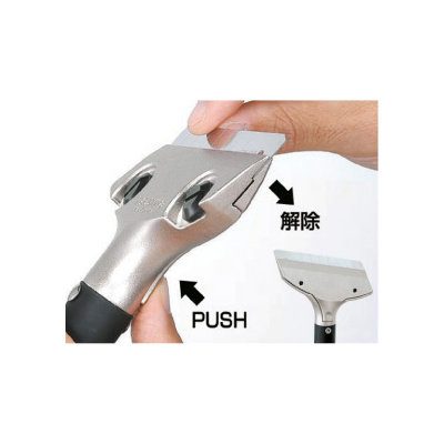 頑固な汚れ等のはがし、削り作業に最適です。握りやすいエラストマー樹脂グリップです。入手しやすいL型カッター用替刃を使用するスクレーパーです。ブレードを強力に固定するダブルネジとブレード交換時の脱落を防ぐ、セーフティバネを内蔵しています。グリップエンドをハンマーで叩いて使用できます。