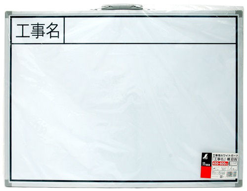 裏面スタンド付です。 持ち運びに便利な取手付です。 ■仕様 ●印刷:工事名 ●横型 ■サイズ:450mm×600mm ■付属品:黒板消し・ホワイトボードマーカー(黒)1本 ■本体:スチール ■枠:アルミ ■取手:ABS樹脂