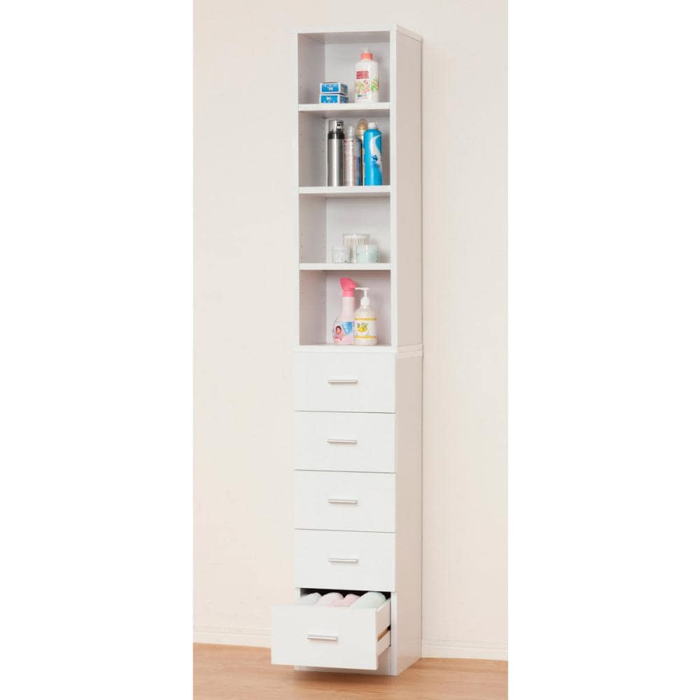 【サイズ】 外寸:約幅30×高さ178×奥行31cm 引出内寸(5杯):約幅23.5×高さ10.5×奥行23.5cm ラック内寸(2ヶ所):約幅26×高さ41.5×奥行27.5cm 【棚の仕様】 中央:固定棚 可動棚2枚・タオル用棚1枚付き 【ピッチ】 7箇所、3.2cm間隔 【耐荷重】 棚:各5kg 引出し:各3kg 【材質】 合成樹脂化粧繊維板・プリント紙化粧繊維板 【原産国】 中国 ※お客様組立商品です。 上部はお客様組立、下部は完成品です。