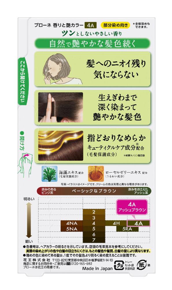 原材料・成分:パラアミノフェノール*、メタアミノフェノール*、トルエン-2,5-ジアミン*、レゾルシン*、5-アミノオルトクレゾール*、水、ステアリルアルコール、PG、MEA、POEセチルエーテル、ステアルトリモニウムクロリド、塩化ジメチルジアリルアンモニウム・アクリルアミド共重合体液、強アンモニア水、ジメチコン、塩化ジメチルジアリルアンモニウム・アクリル酸共重合体液、流動パラフィン、ベヘニルアルコール、オレイルアルコール、ポリ塩化ジメチルメチレンピペリジニウム液、高重合ジメチコン-1、アミノエチルアミノプロピル・メチルポリシロキサン 共重合体、香料、無水亜硫酸Na、アスコルビン酸、炭酸水素アンモニウム、塩化ジアルキル(12~18)ジメチルアンモニウム液、エデト酸塩、イソプロパノール、カモミラエキス-1、ローヤルゼリーエキス、海藻エキス-1、長鎖二塩基酸ビス3-メトキシプロピルアミド、パラベン、BG、エタノール、リン酸*は「有効成分」無表示は「その他の成分」過酸化水素水*、水、流動パラフィン、ベヘニルアルコール、濃グリセリン、POEセチルエーテル、ステアリルアルコール、塩化アルキルトリメチルアンモニウム、ベタイン、エタノール、硫酸オキシキノリン-2、リン酸、軟質ラノリン脂肪酸、水酸化ナトリウム液 *は「有効成分」無表示は「その他の成分」