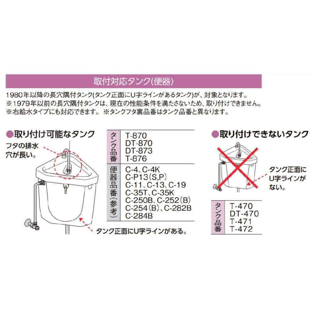 マルチボールタップで対応できない隅付タイプで、フタの排水穴が長い「長穴隅付タンク」専用品です。