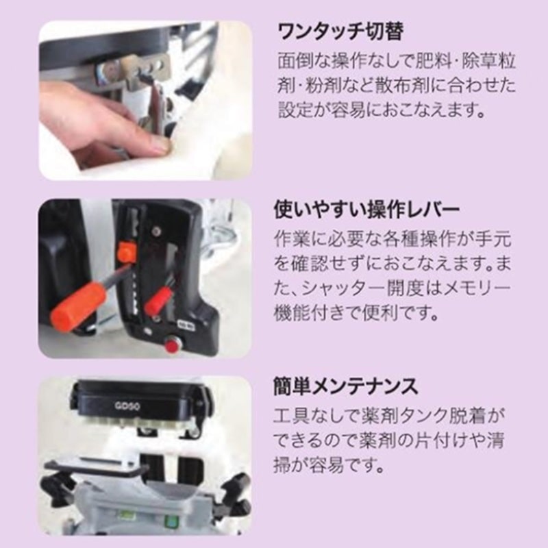 ●ワンタッチ切り替え:肥料・除草剤・粉剤の切り替えがワンタッチで設定できます。