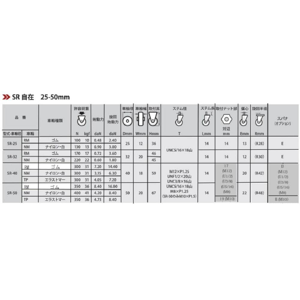 ●材質:金具、スチール 車輪、ゴム ●耐荷重:31kgf●SRシリーズ用途:什器、家具、ワゴン、医療器械、搬送機器、各種装置・機材等。
