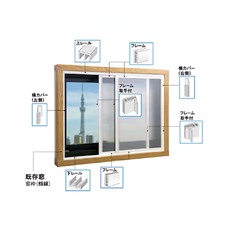 商品内訳※施工サイズにカットした部材、面材をお届けいたします。 上レール 1本、下レール 1本、横カバー 2本、取手付きフレーム 4本、フレーム 4本、専用両面テープ 1巻、専用面材 中空ポリカ2枚、タッピングねじ、取説チラシ *両面テープで固定をしますが、時間の経過で上部が歪んでくる場合がございます。 タッピングねじでレールを頑丈に固定をすることも可能です。(プラスドライバーが必要となります)