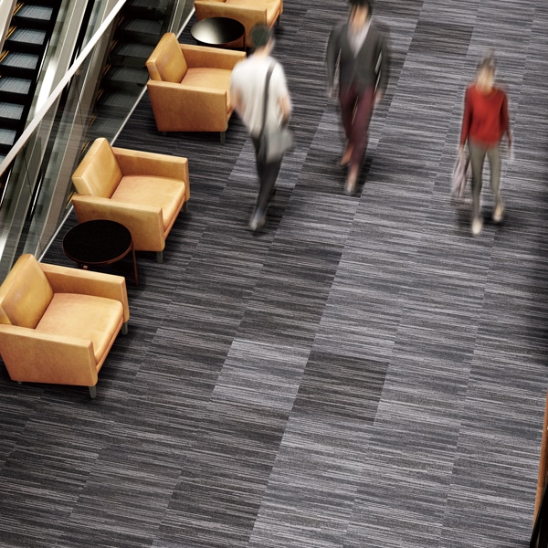 空港、デパート、店舗を始め、オフィス、学校、病院、会館等ロビー、エントランスホールや廊下など、歩行量が多く、また台車などの重量物が頻繁に往来するような部位に適しています。