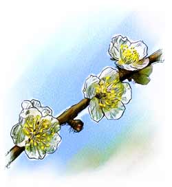 旧暦の正月は、1月末から2月初めであることが多かったから、雪国を除くとウメは開いていた。春一番に咲く、芳香を含んだ清楚なウメの花は誰からも愛され、それは今に続いている。 |