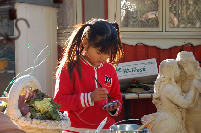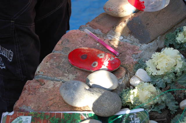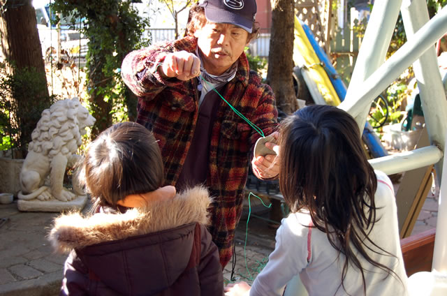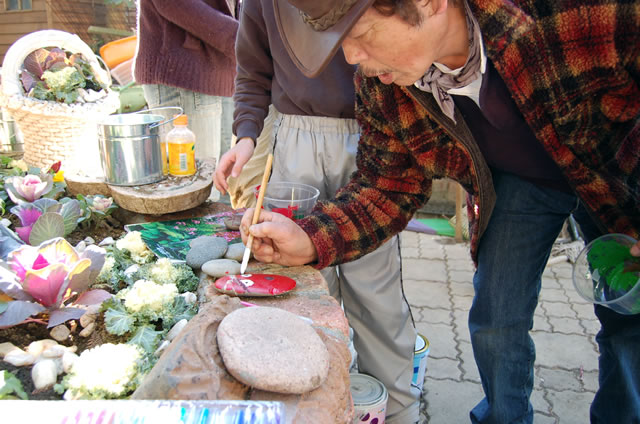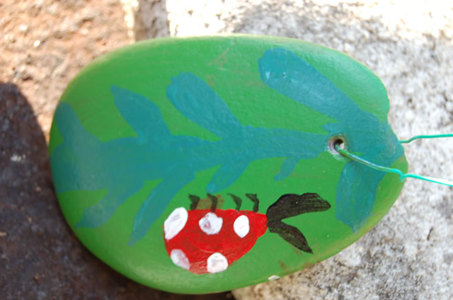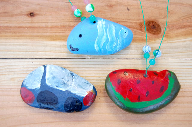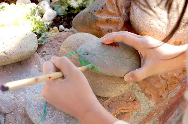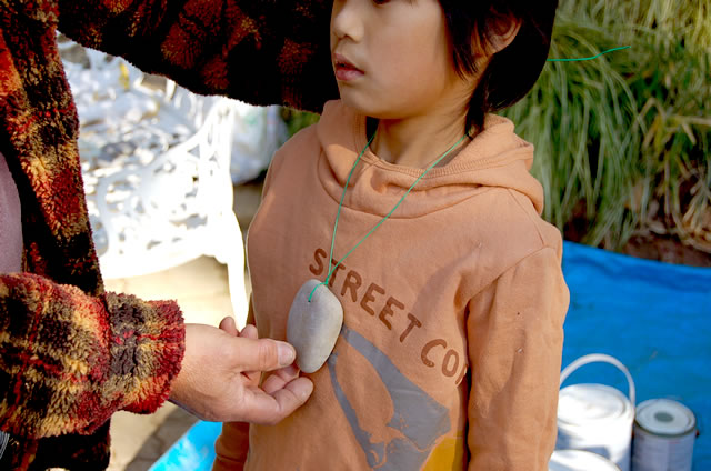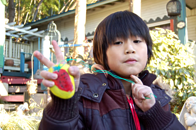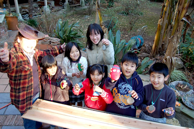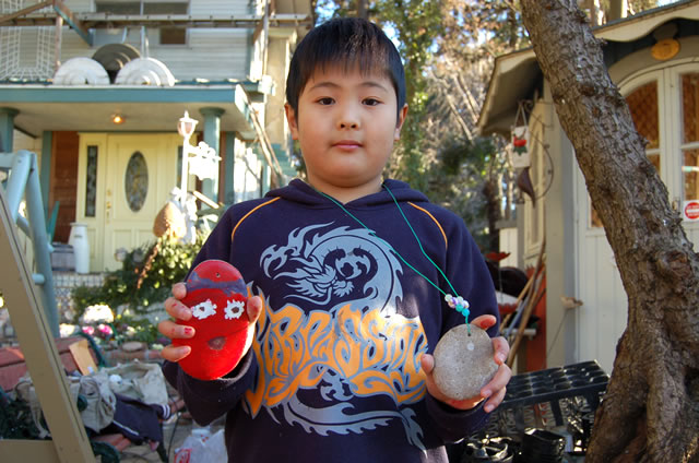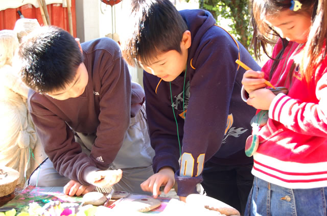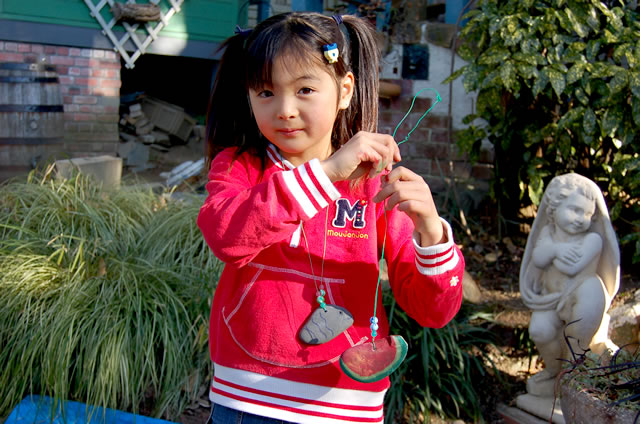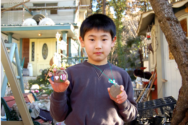 冬の晴れた日に、「ルネッサン荘」に集まったキッズたち。 今日は気持ちいい1日になりそうです! さあ今日は、石でペンダントを作ります。 キッズたちは、とにかく自分の好きなように絵を描いて、色を塗る、それだけです! まず、石を拾いに出かけます。石選びのポイントは、 ★ 平べったくて ★ 重たすぎない これに尽きます! |