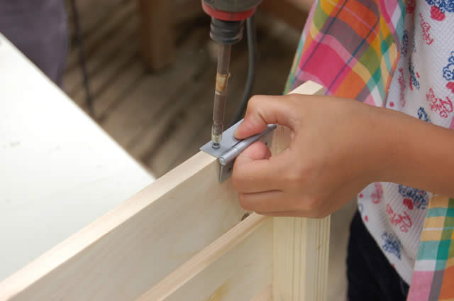 ベニヤ板を30cm×23cmに切って台を作り、蝶番を2ヶ所取り付けます。 |