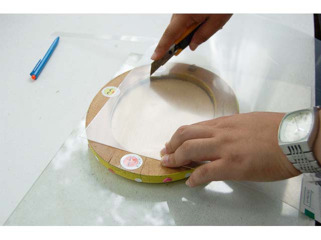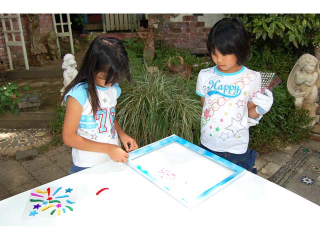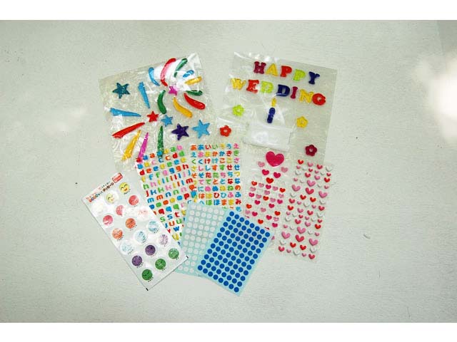 シールを貼っていきます。シールでなくても、接着剤があれば貼り付けられます。 ここはみんなが一番こだわる部分です! |