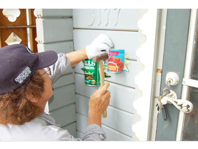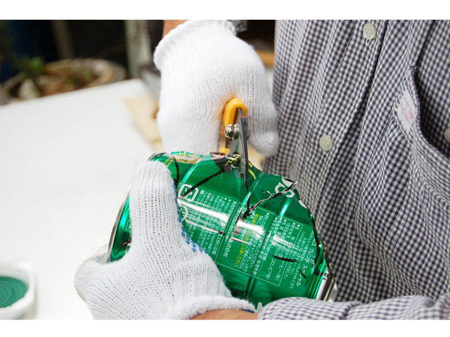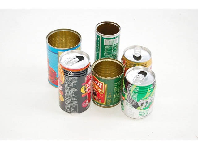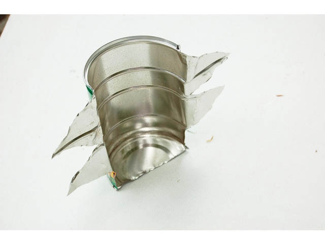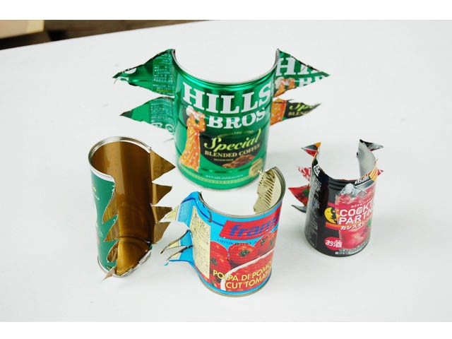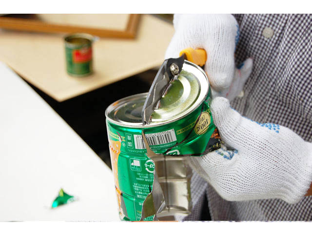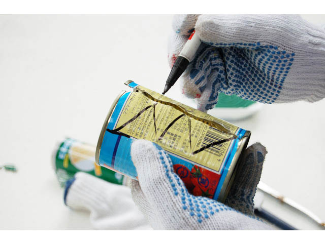 ギザギザに沿って、万能バサミで切ります。 | 缶の底も切ります。 | |