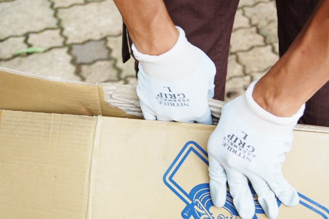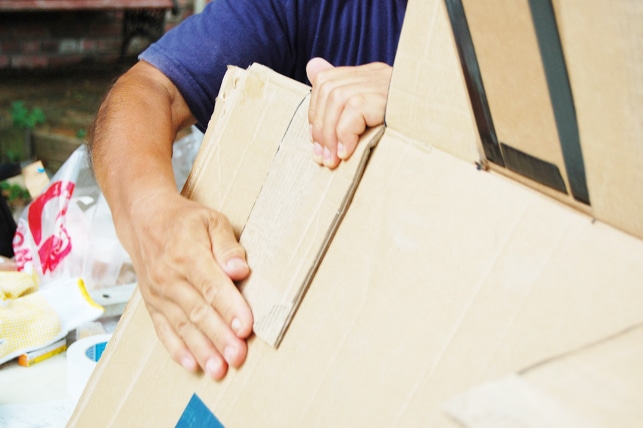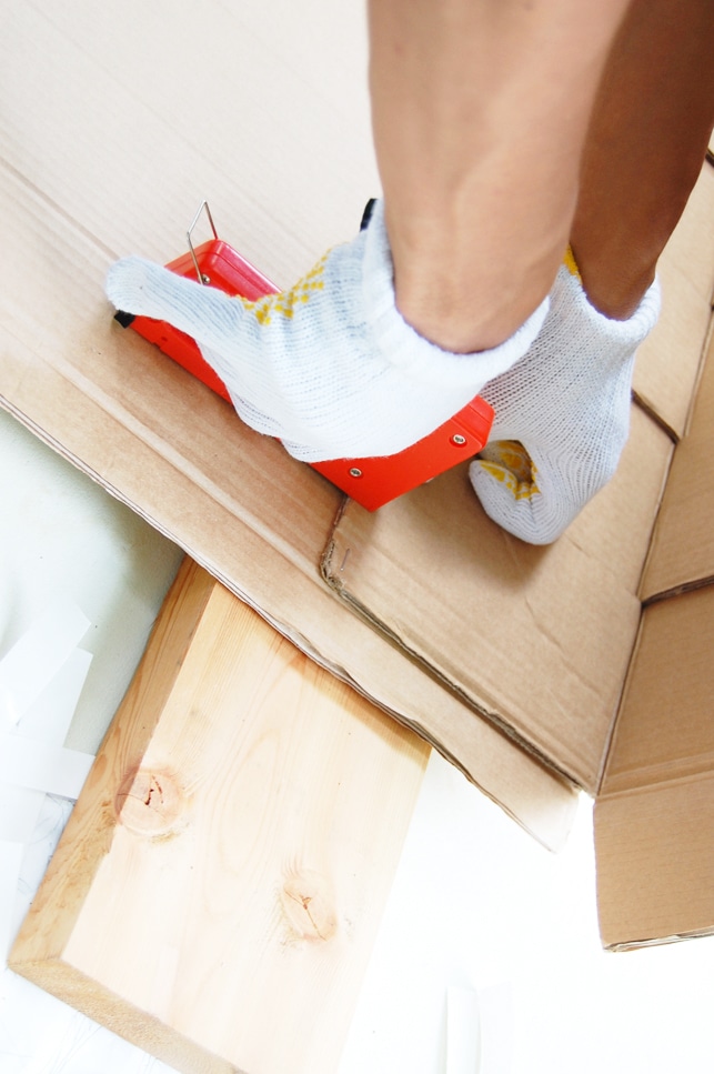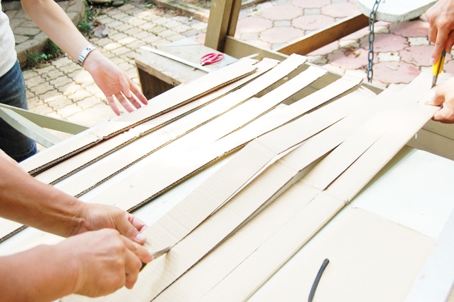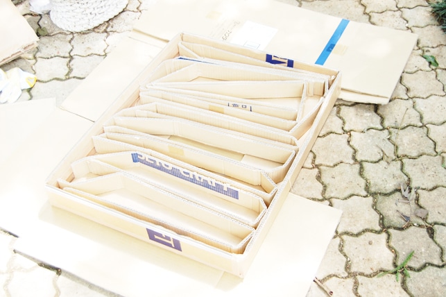 | 床を補強する為に細長いダンボールをたくさん作ります。 | 細長いダンボールを下に敷きつめます。 | ||