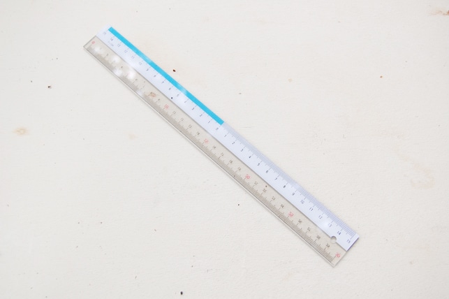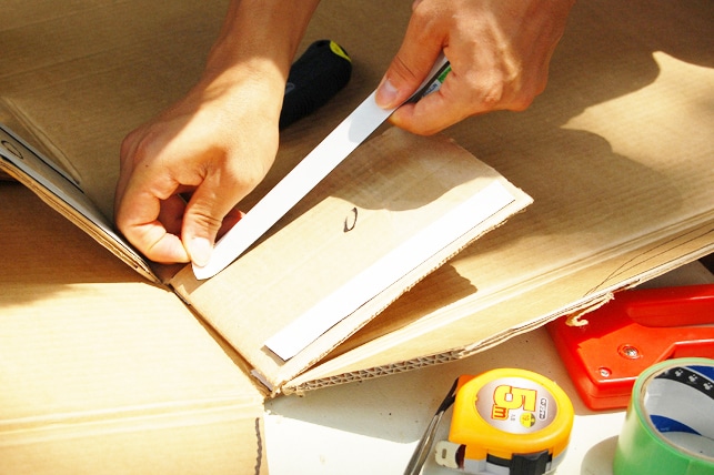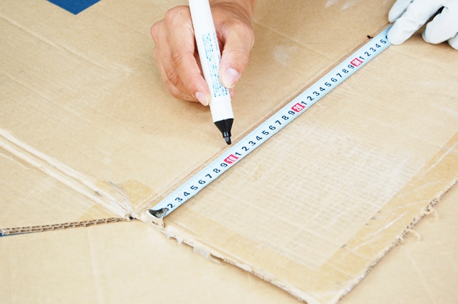 | 外壁の部分で作った”のりしろ”と同じダンボールで屋根を組み立てるための”ひだ”を作ります。 | ものさしで均等に”ひだ”の部分の幅を測って、油性マジックで印をつけます。 | ||