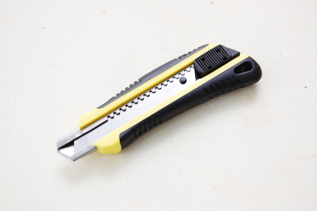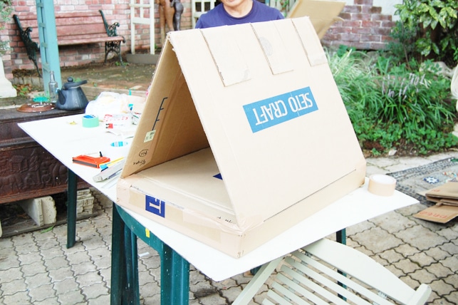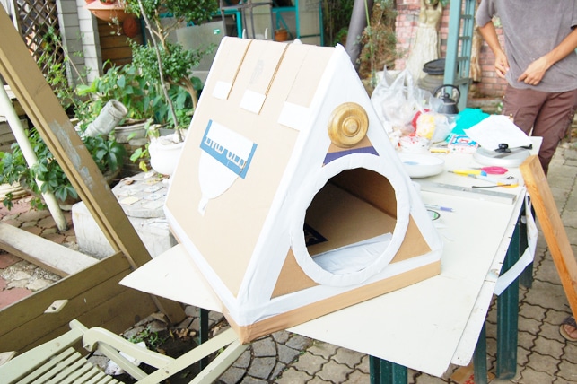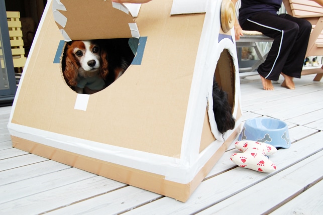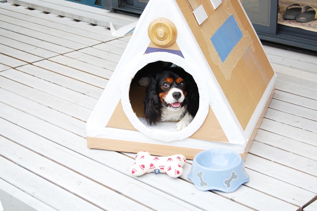 | 鍋ぶたなどで形を縁どり、カッターで切り取ります。 | 犬小屋のまわり全体に白い粘着テープをキレイに貼っていき、アクセントに小物をつける。 | ||