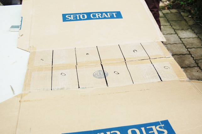 | 印をつけた所に線を引きます。○印は2個のダンボールを組み合わせた時、交互に重ねていく為の印です。あとは、油性マジックで線を引いた所をカッターで切っていきます。 | |||||