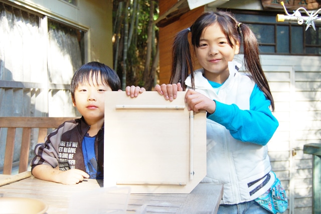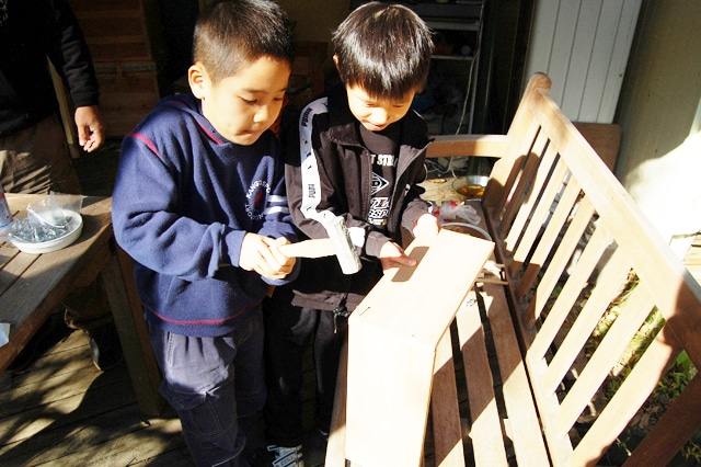 | キリであけた穴にクギを挿して、トンカチで屋根と土台を組み立てます。 | |||