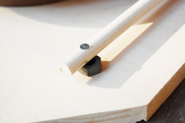 | 小鳥の止まり木をつくります。止まり木を浮かせるために、丸棒の下に止め口を入れてクギでとめます。 | |||