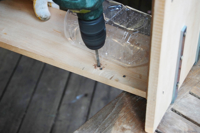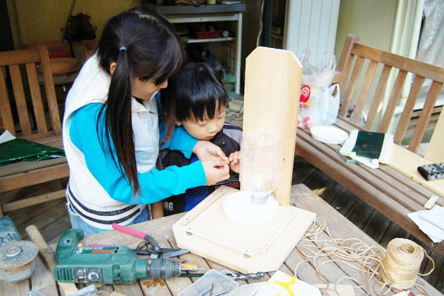 | さらにペットボトルを固定させるために、背中になる板に電動ドリルで穴をあけて、麻紐を通して後ろで結びます。 | |||