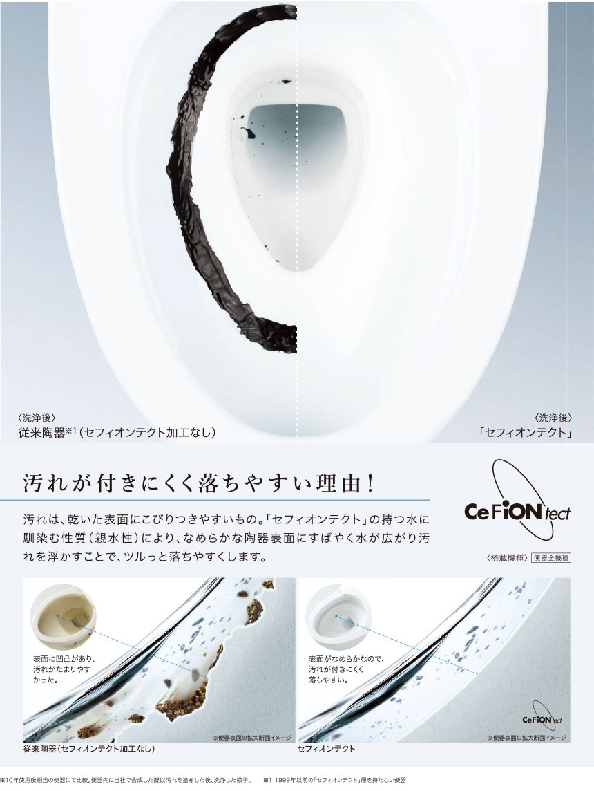 従来の便器の表面には、目に見えない小さな凹凸があり、このくぼみに細かい汚れが残ってしまいますが、セフィオンテクトは、陶器表面の凹凸を100万分の1mmのナノレベルでツルツルに仕上げているので、汚れが付きにくく、落ちやすくなります。