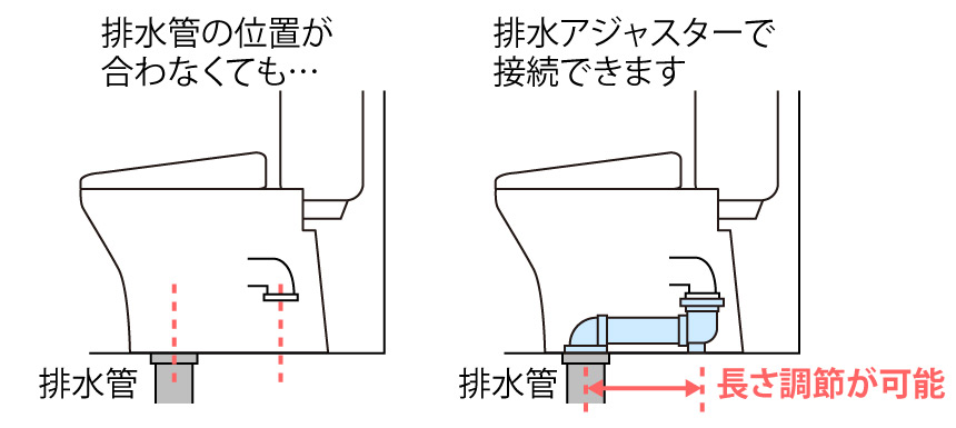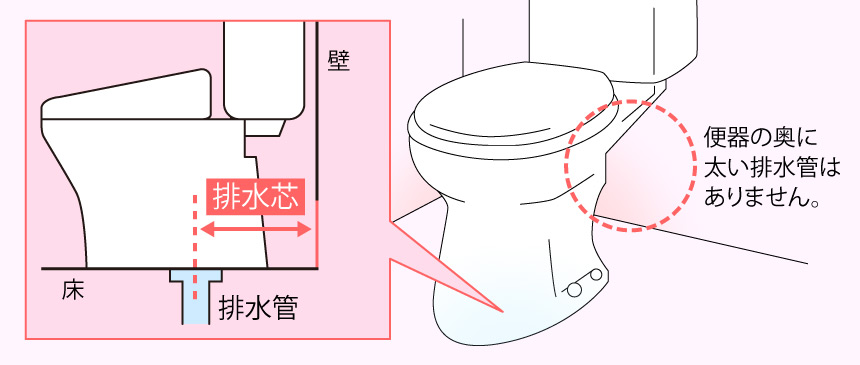 1995年(平成7年)以前に建てられた(リフォームされた)トイレは様々なサイズに排水管が設置されており「排水芯」も様々です。そのため、排水管の移設を行うことなく、排水位置を調整することのできる排水芯を使用します。
