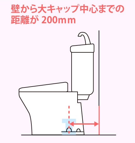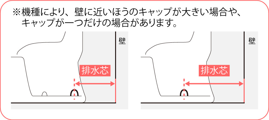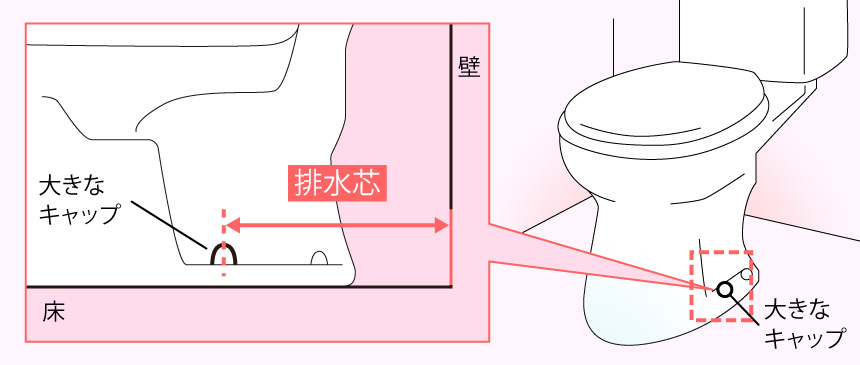 このキャップは大小2種類があり大きなほうが目印となります。便器背面(タンク側)の壁から大きなほうのキャップ中心までの距離が排水芯となります。