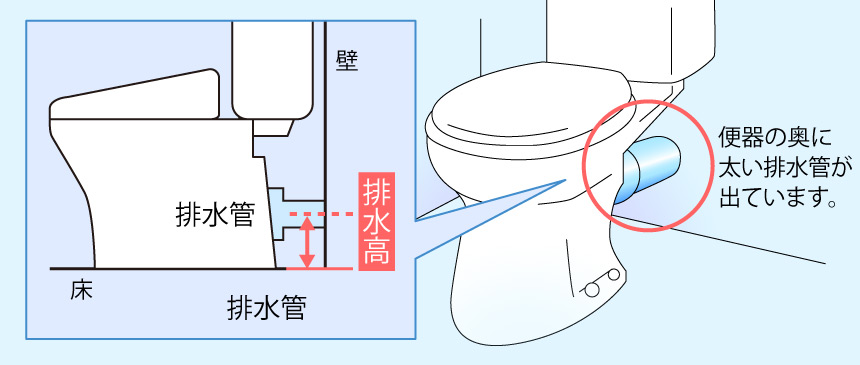 マンションや公団などに採用されている、便器後方から壁方向に向かって排水をする「壁排水」の場合、排水を行う配管の高さ、「排水高」が2種類があります。