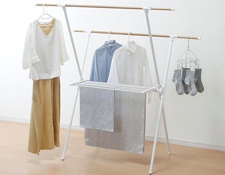 X型は2本のバーがあるので、たっぷり洗濯物を干すことが出来、軽いので移動も簡単です。また必要がない時は折りたたむことが出来るので、コンパクトに収納可能です。