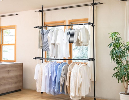 突っ張りタイプの物干しはバネ圧着式なので、ワンタッチで取り付けでき、取り外しや移動も楽にできます。天井や床をキズつけることなくお使いいただけます。アームはお好みの高さに設置できます。