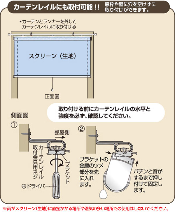 TOP > オーダーロールスクリーン > ロールスクリーンの取り付け方 ロールスクリーンの取り付け方 取り付け方法 ■取り付け上の注意 ※この製品は木部取り付専用です。取り付け部が木部(板厚10mm以上)であることをご確認ください。 ※付属のビスは木部専用です。木部以外には取り付けできません。 ※この製品は木ネジを使用して取り付けますので、取り付場所が木部(板厚10mm以上)であることをご確認の上、正面付か天井付のどちらかで取り付けてください。 戻る