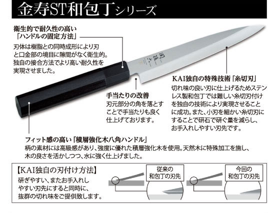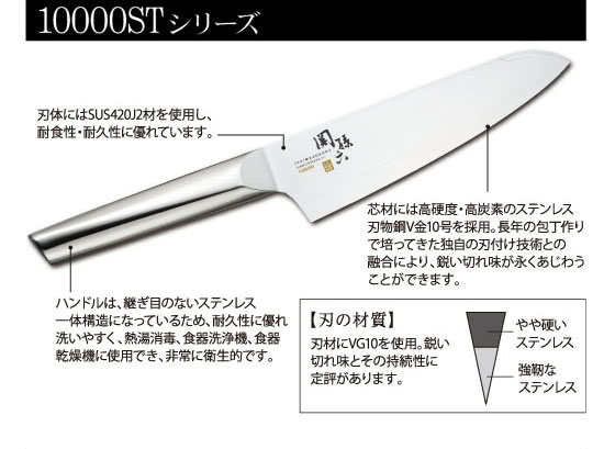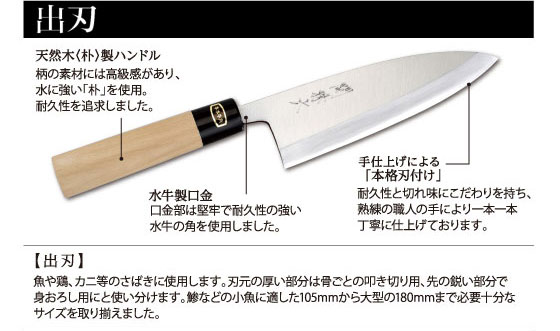 サビに強く、鋭い切れ味が長続きします。柄は耐久性のある積層強化木。又、中子との接合方法によって頑丈で衛生的。