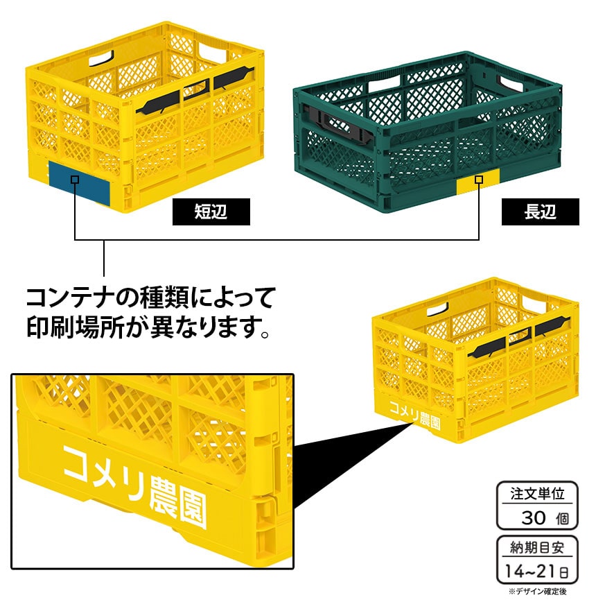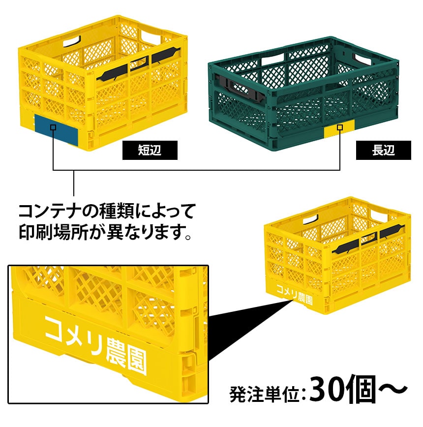 コメリでは折りたたみコンテナの名入れサービスを承っております。社名を入れることで作業効率向上が図れます。